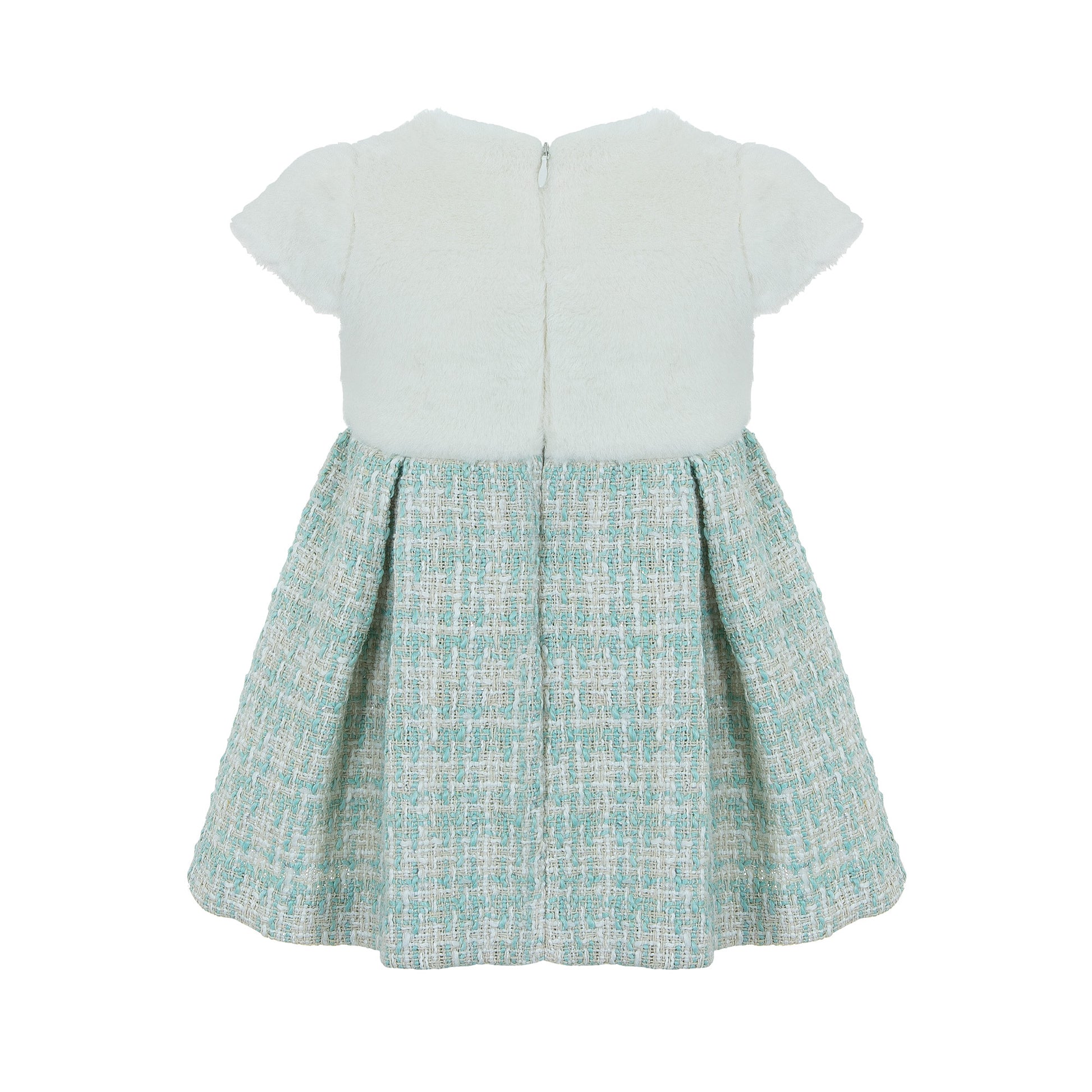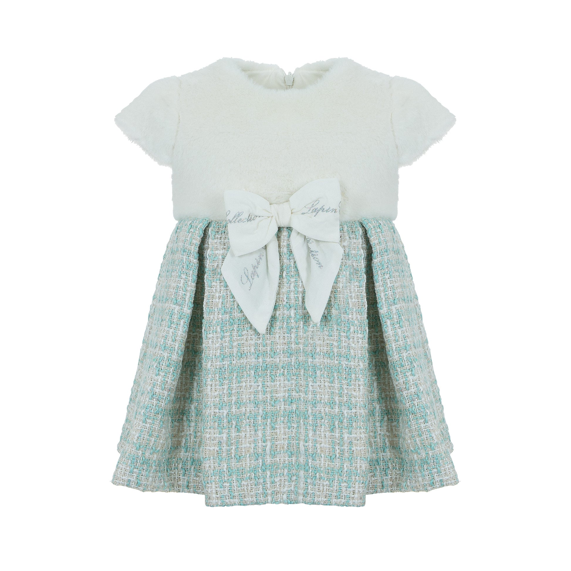 Παιδικό φόρεμα Lapin House σε διχρωμία, με γούνινη υφή στο επάνω μέρος και καρό φούστα σε αποχρώσεις μέντας. Διακοσμημένο με εντυπωσιακό φιόγκο στη μέση. Ιδανικό για ξεχωριστές περιστάσεις.