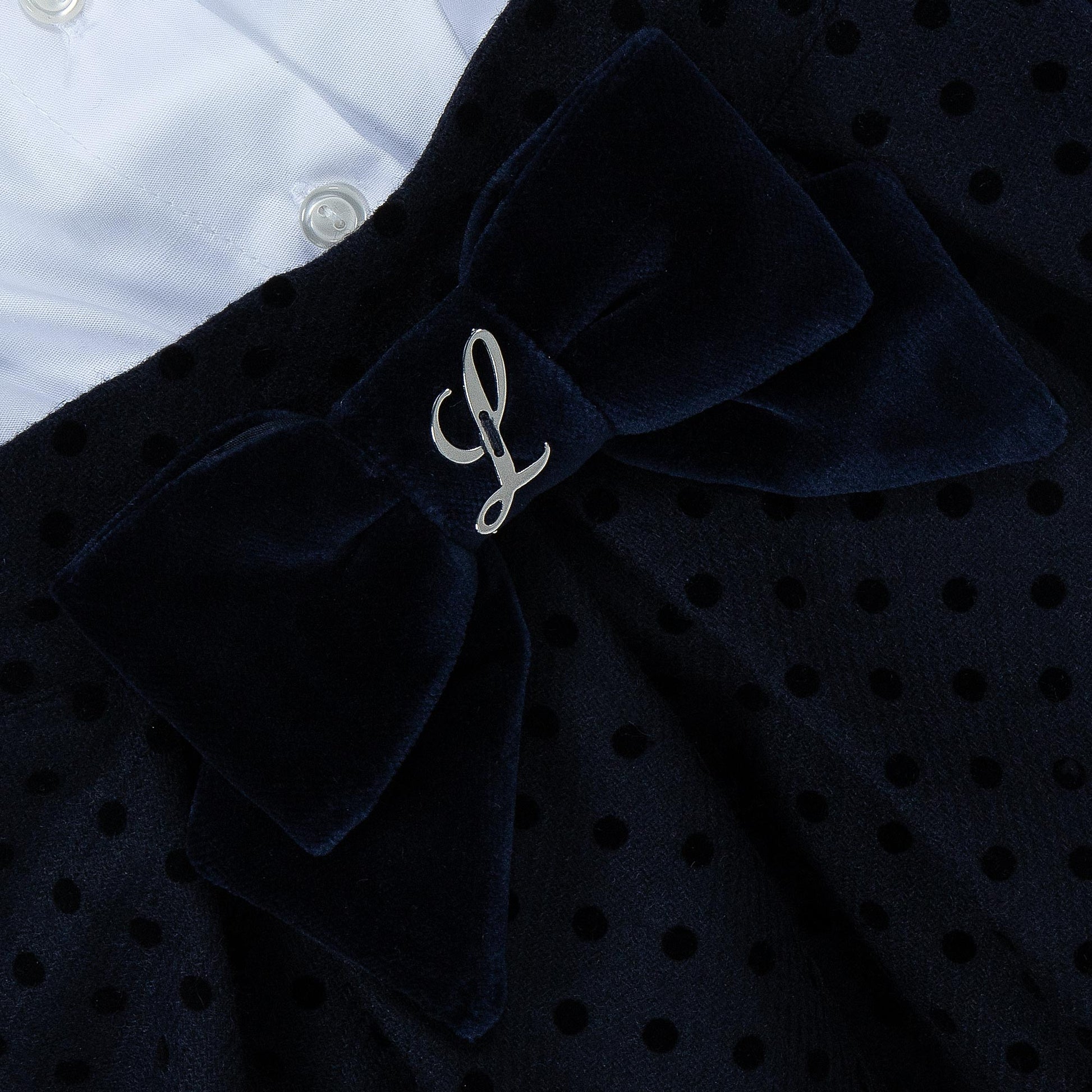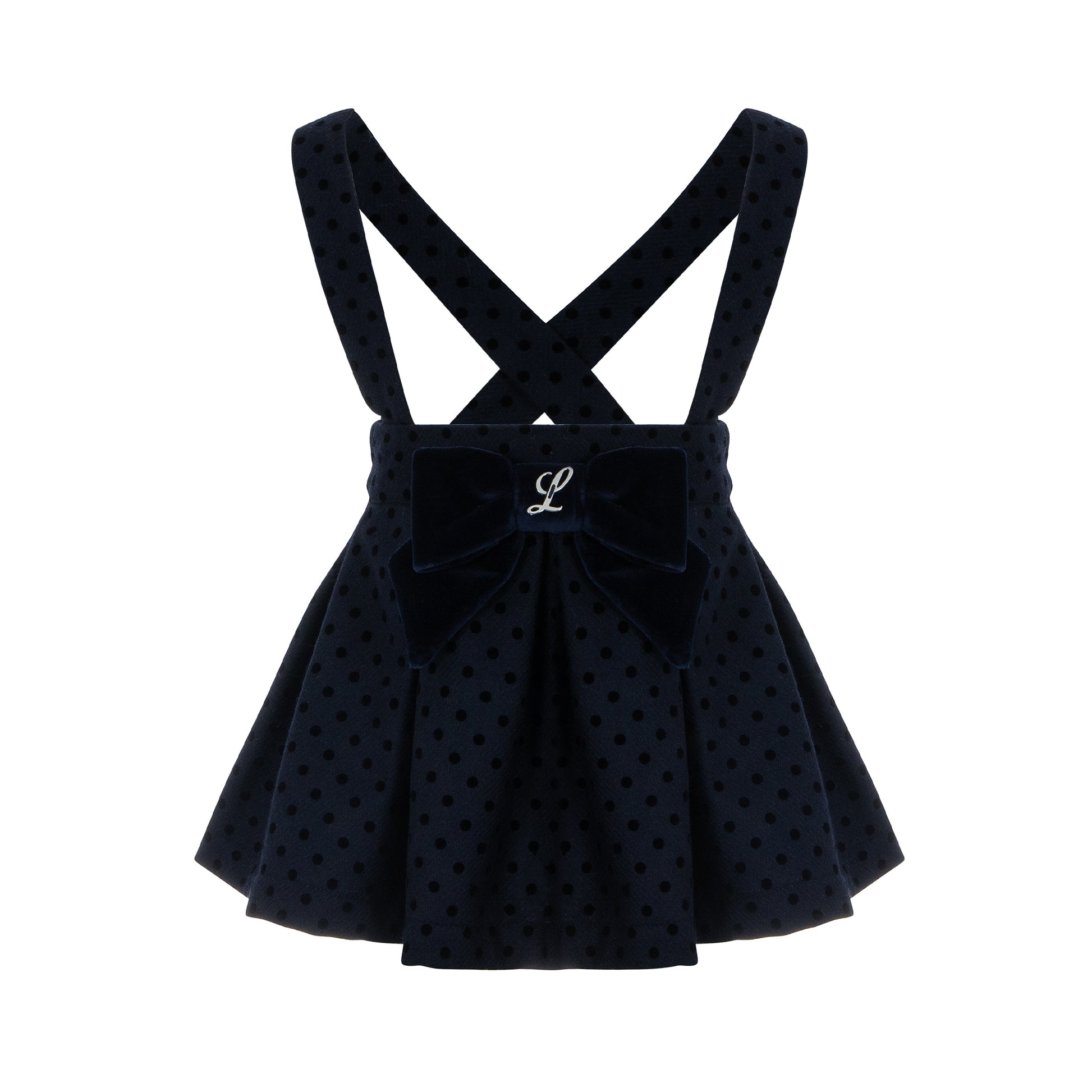 • Βελούδινη σαλοπέτα-φούστα με τιράντες και φαρδύ φιόγκο με μεταλλικό μονόγραμμα “L”