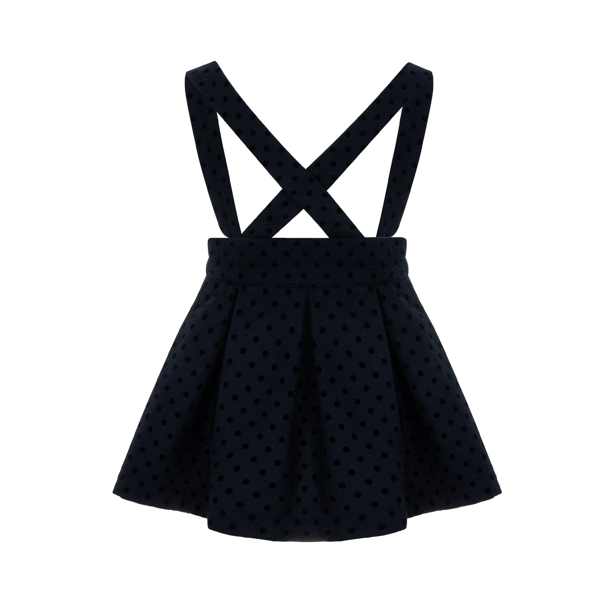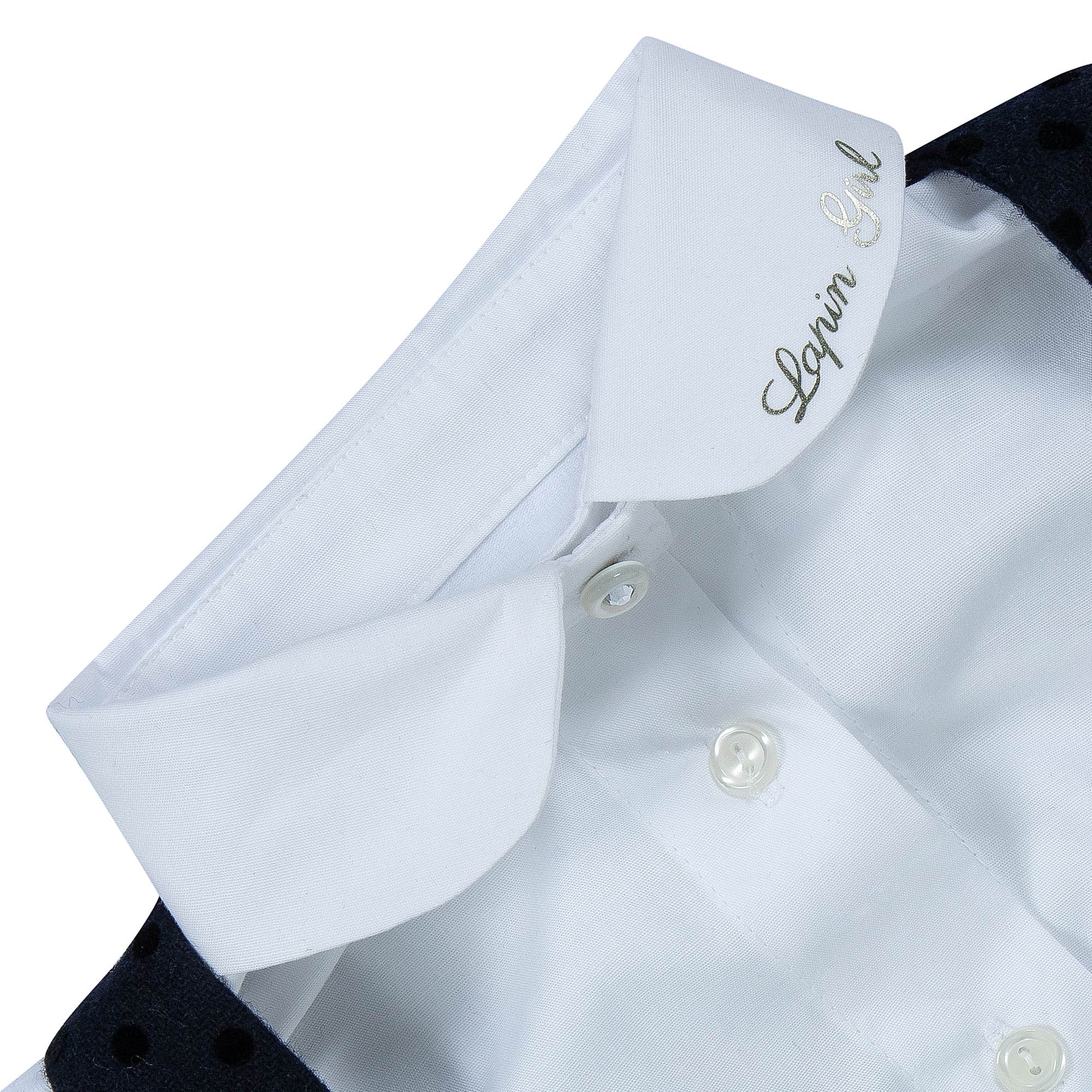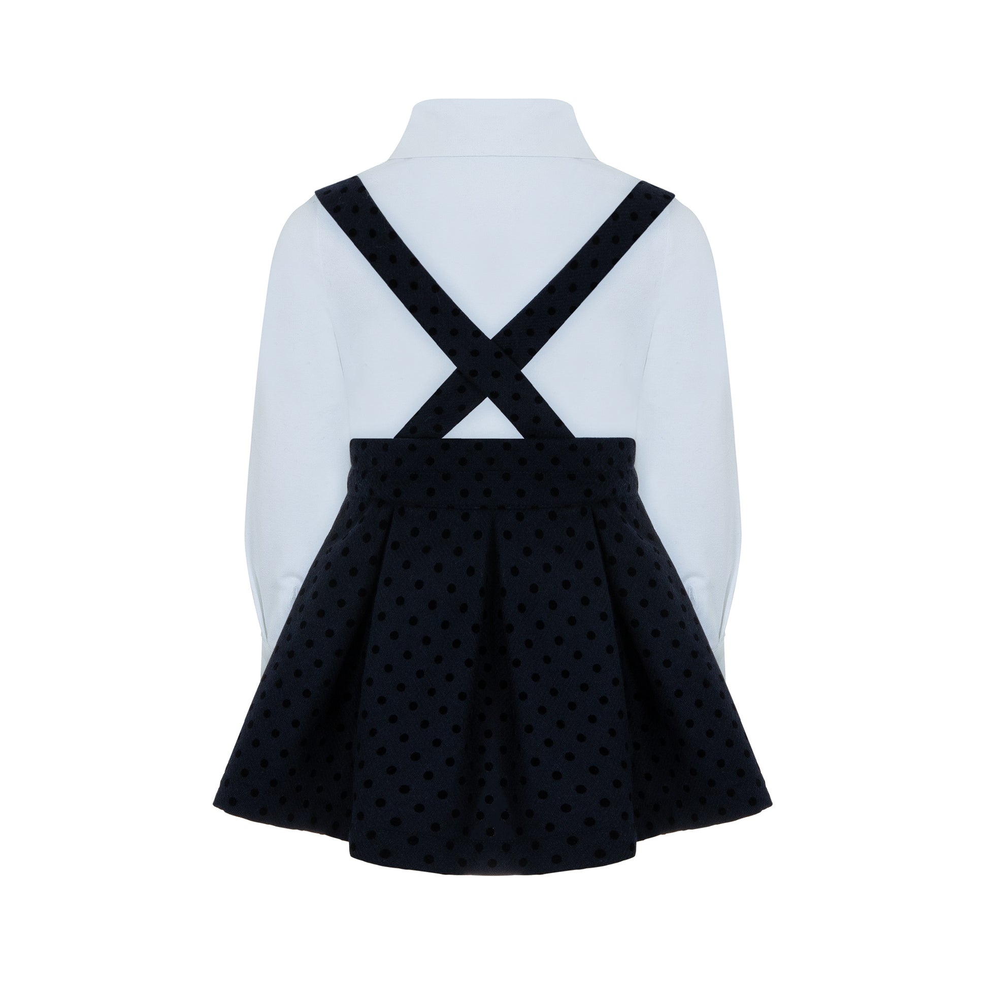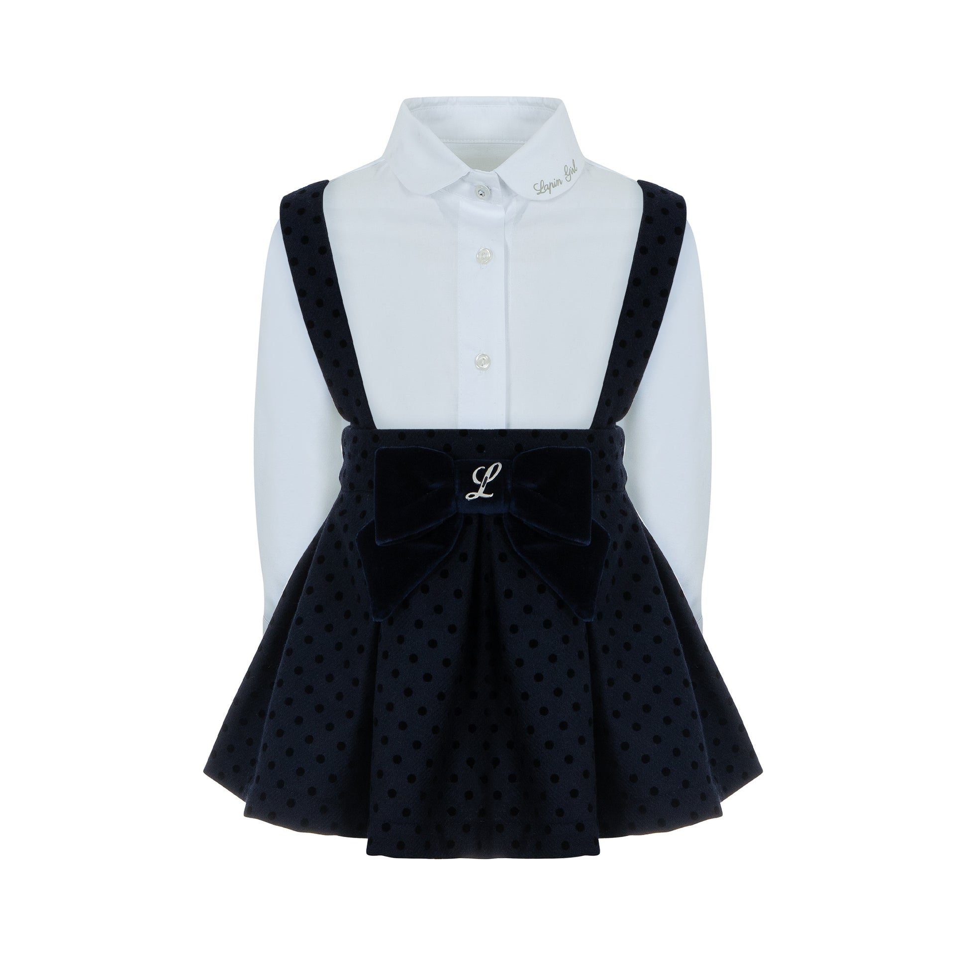 Κομψό παιδικό σετ Lapin House ιδανικό για ιδιαίτερες περιστάσεις. Περιλαμβάνει λευκό πουκάμισο με γιακά και navy σαλοπέτα-φούστα από βελούδινο ύφασμα με πουά υφή.